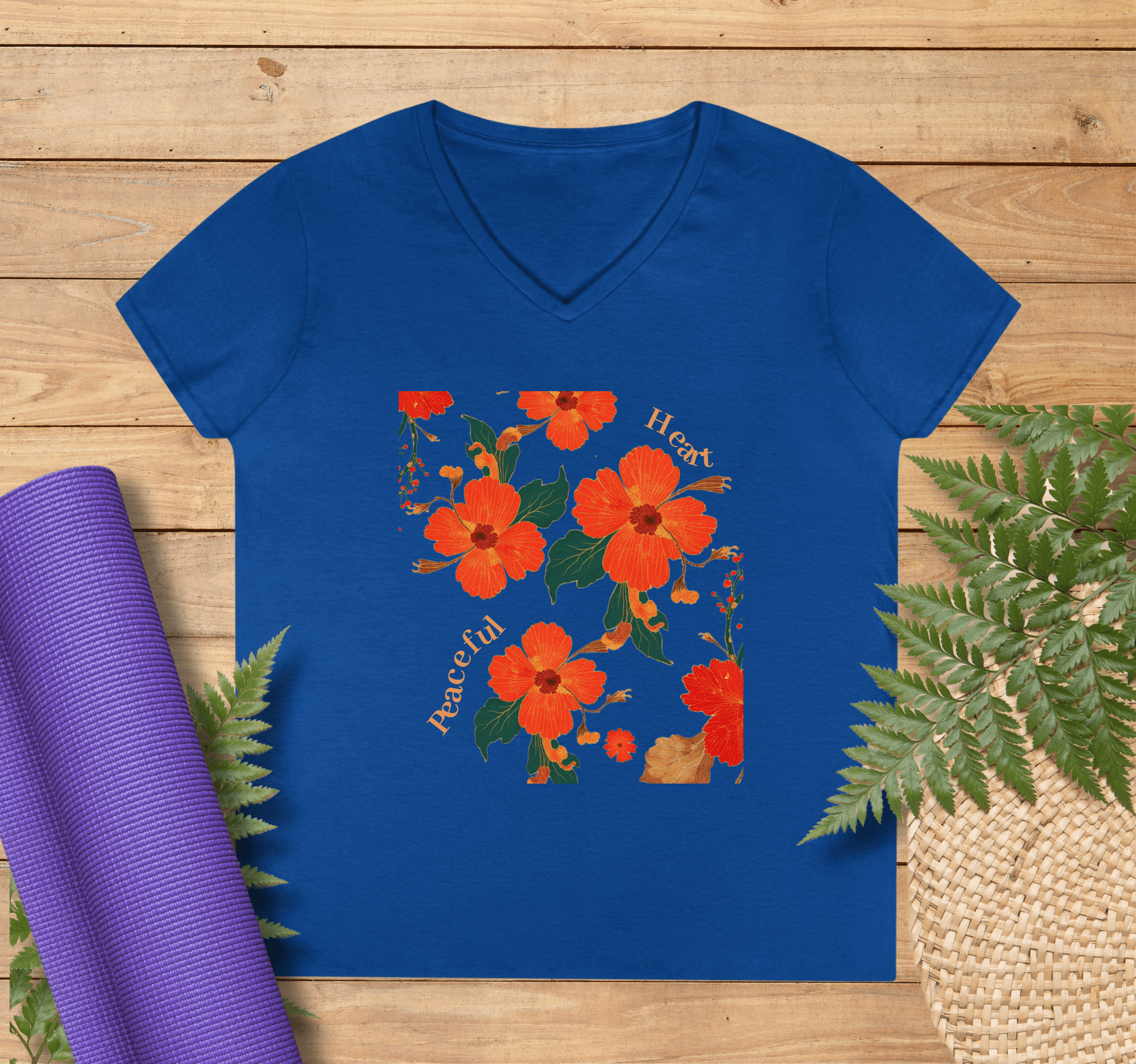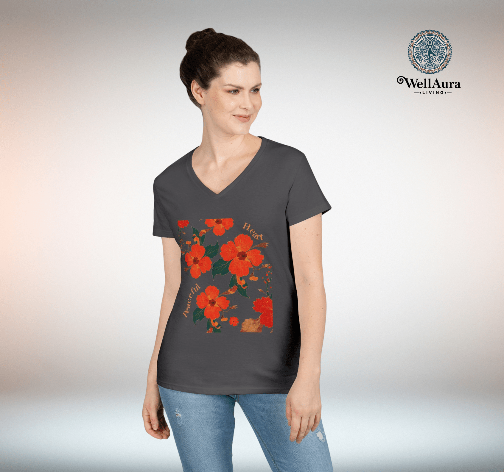 The WellAura Lorelei V-Neck is a soft, breathable shirt featuring radiant floral artwork and bold orange-red blossoms that symbolize tranquility and love. Perfect for yoga, mindful mornings, creative days, or heartfelt gifting. Let it inspire your journey—one bloom at a time.